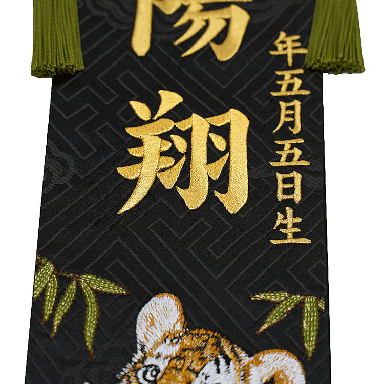 可愛らしい子虎と健康と成長の象徴とされる竹の刺繍された名前旗です。