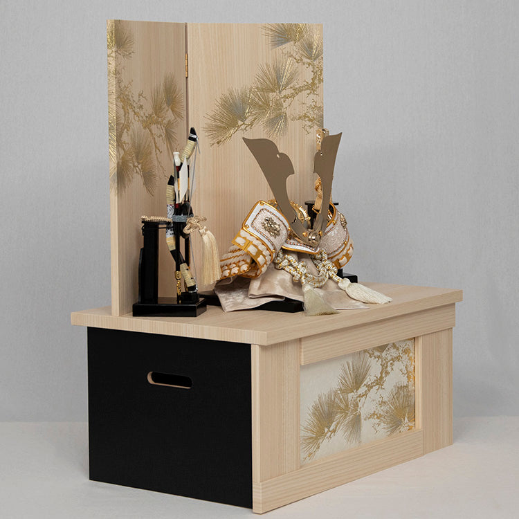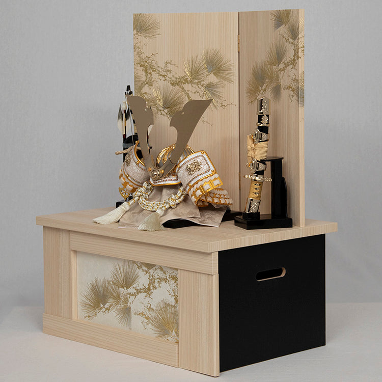 目調の美しい台屏風に白を基調とした兜を合わせた落ち着いた印象のお飾りです。