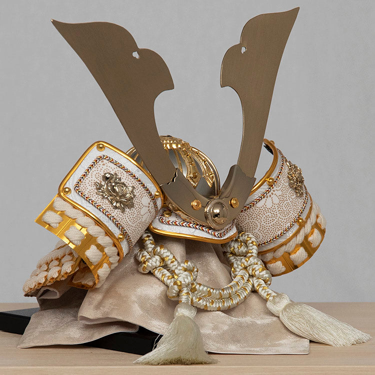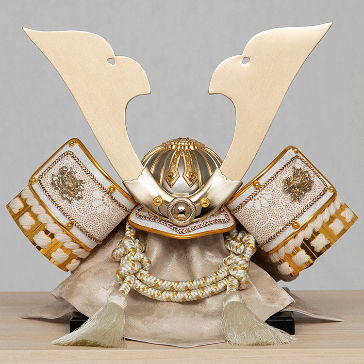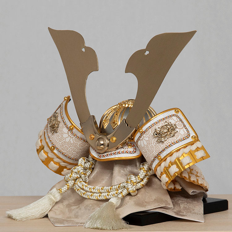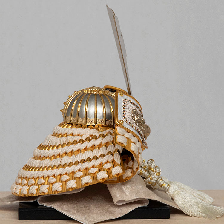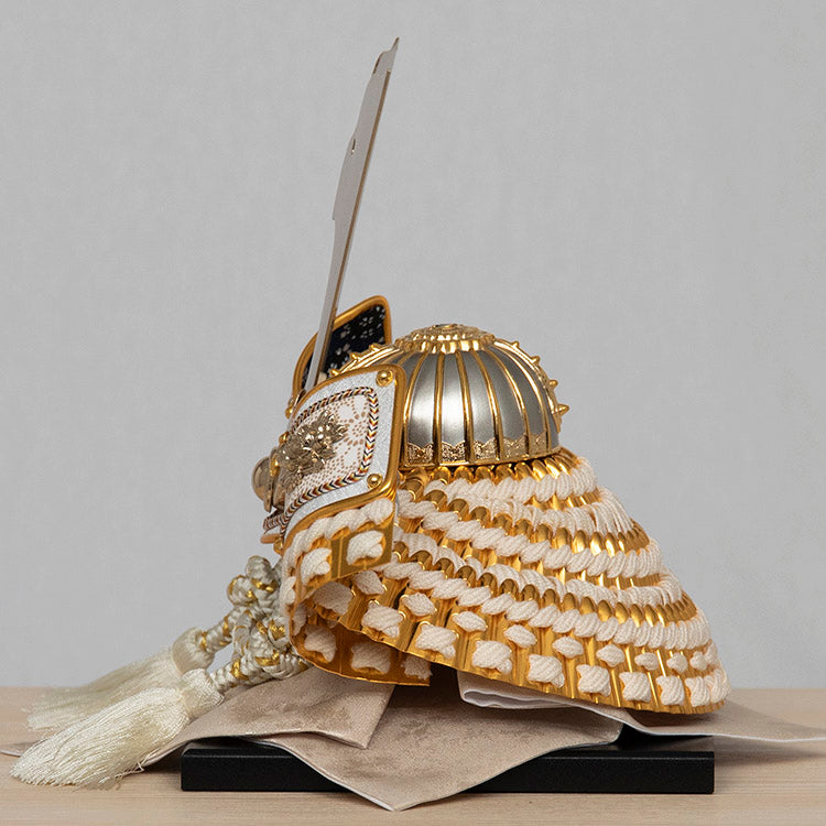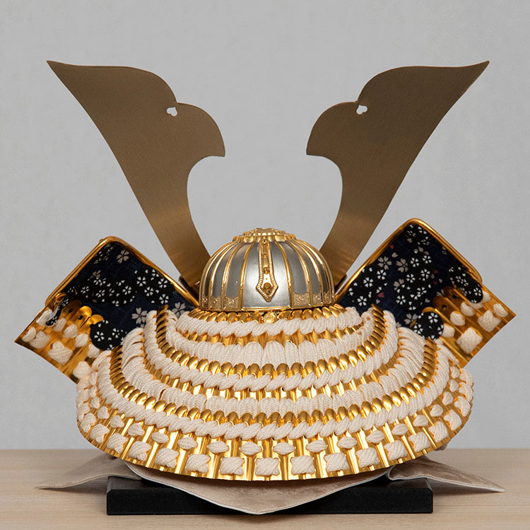 シャンパンゴールドの大鍬形の前立てが美しい兜飾りです。