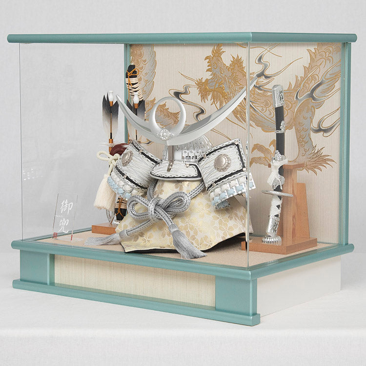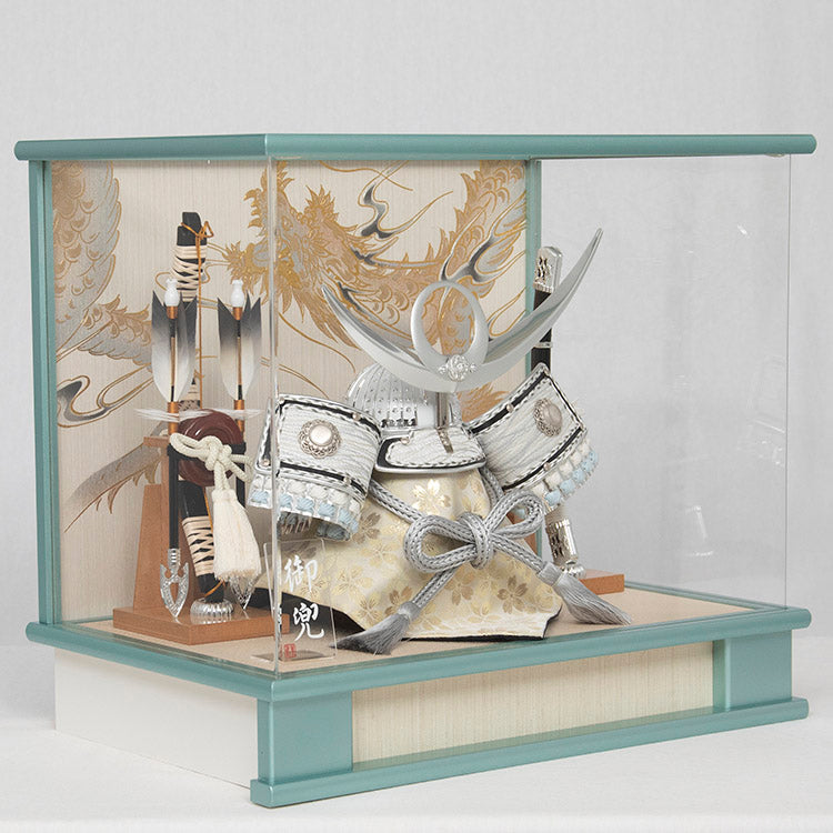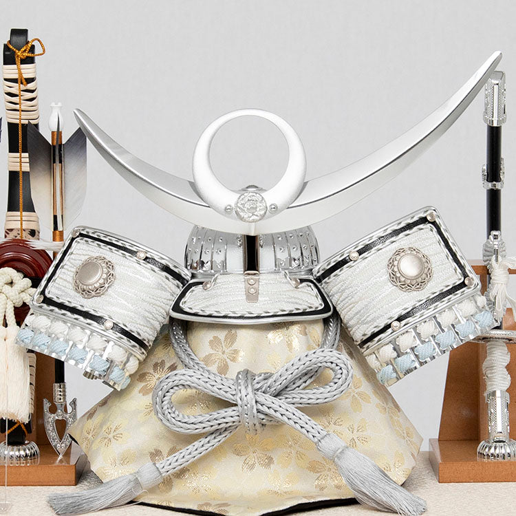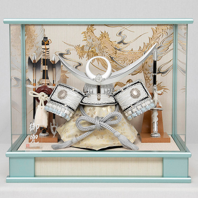 白と銀色を基調とした兜と、上品な色合いが印象的なケース飾りです。