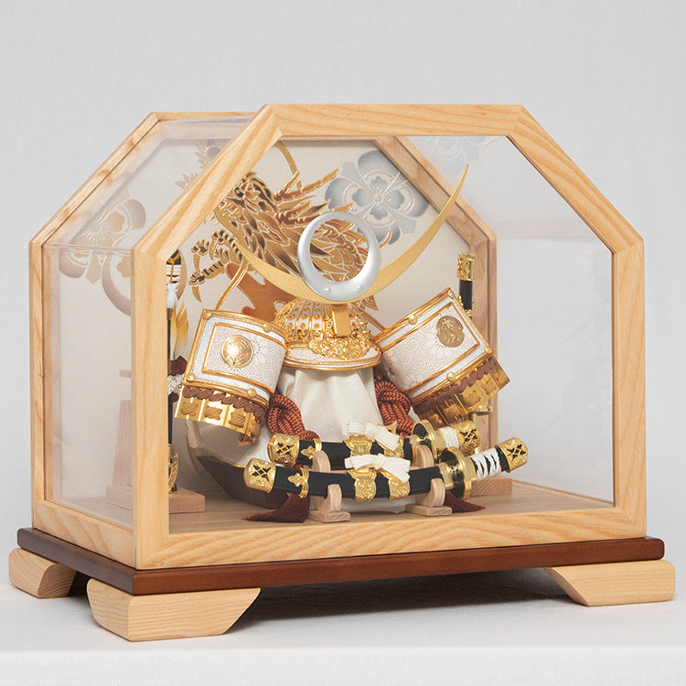 背景の金色の龍が兜を引き立てています。