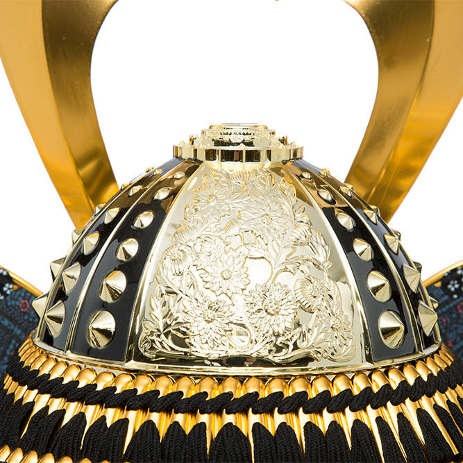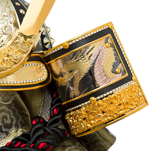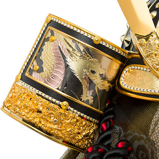立体加工の鍬形の兜飾りです。お子様が被って写真撮影できます。格子飾りと円龍が兜飾りを引き立てています。立身出世の象徴である勇壮な龍を吹返しに配し、男の子の健やかな成長を願います。