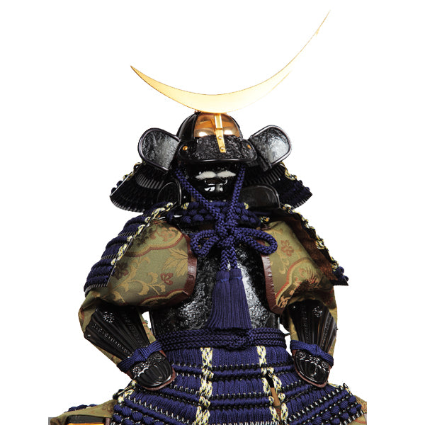 紺色の糸威で編み上げた伊達政宗公の鎧飾りを連山柄の黒色ケースに配しました。