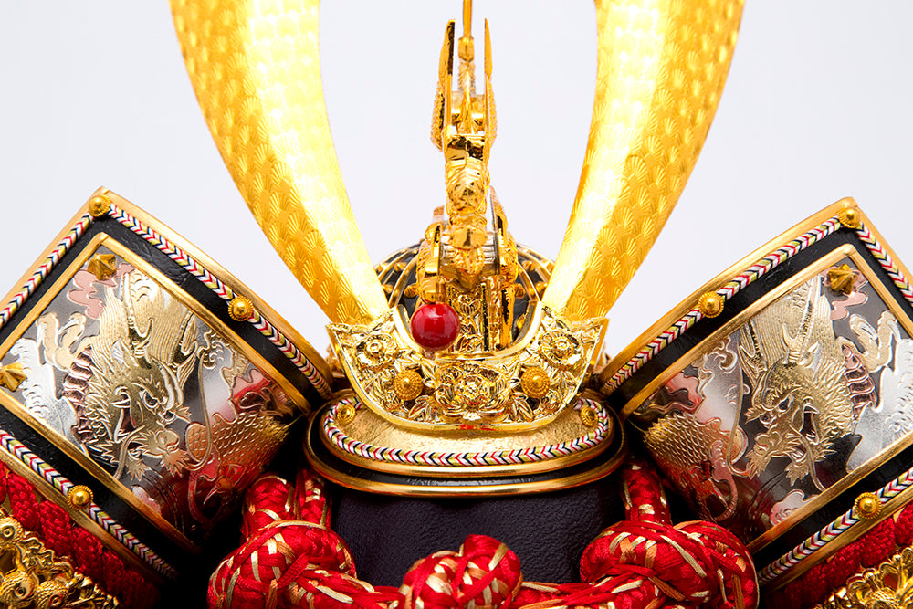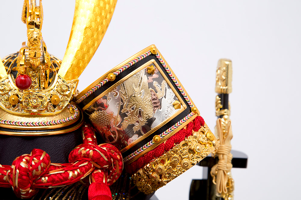 前面についたLEDが兜をきれいに照らし出します。金彩加工の松がキラキラ光り兜を豪華に演出します。赤色の忍びの緒がアクセントになっています。