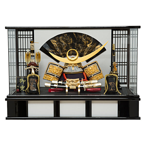 龍が描かれためでたい末広がりの扇を飾り付けました。前飾りに魔を打ち払うといわれる太刀を二本配しました。