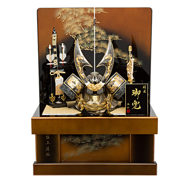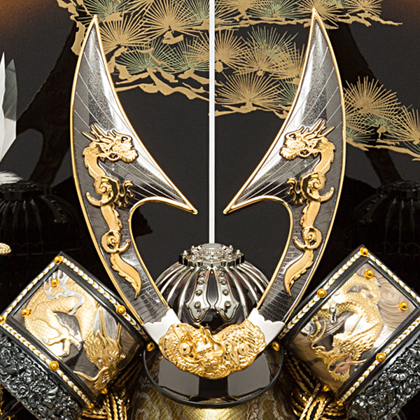 おめでたい松の葉の台・屏風に、昇龍を鍬形に配した力強いお飾りです。