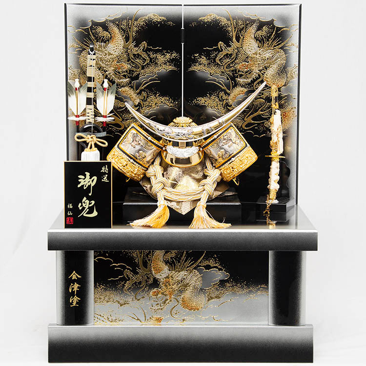 会津塗の台と屏風にあしらった、猛々しい龍がお子様の成長を見守ります。