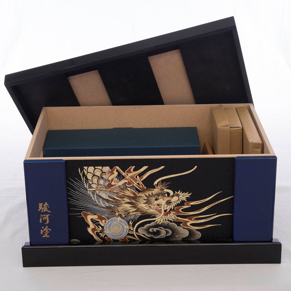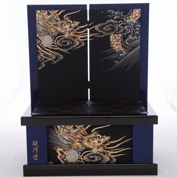 深みのある青を基調とし猛々しく躍動する龍を配した台屏風に、銀の大鍬形が引き立つ兜収納飾りです。