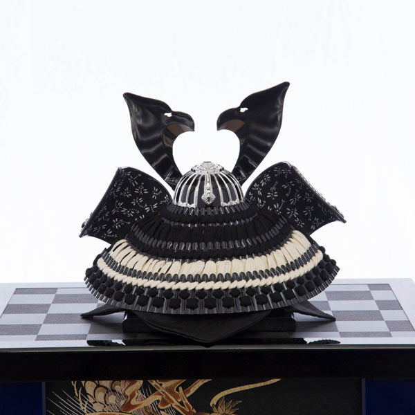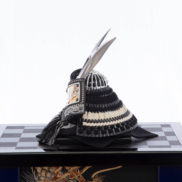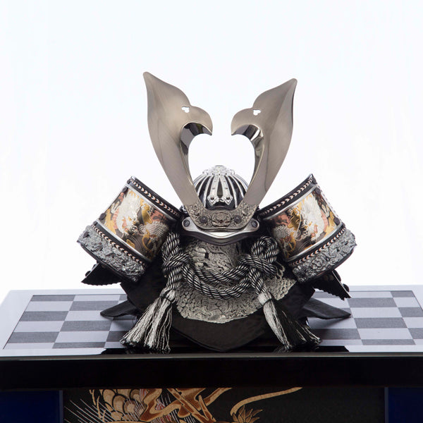 銀の大鍬形兜を、深みのある青の台屏風に配しました。