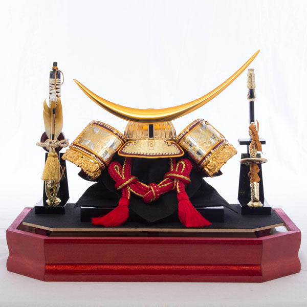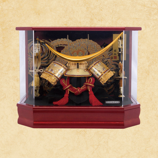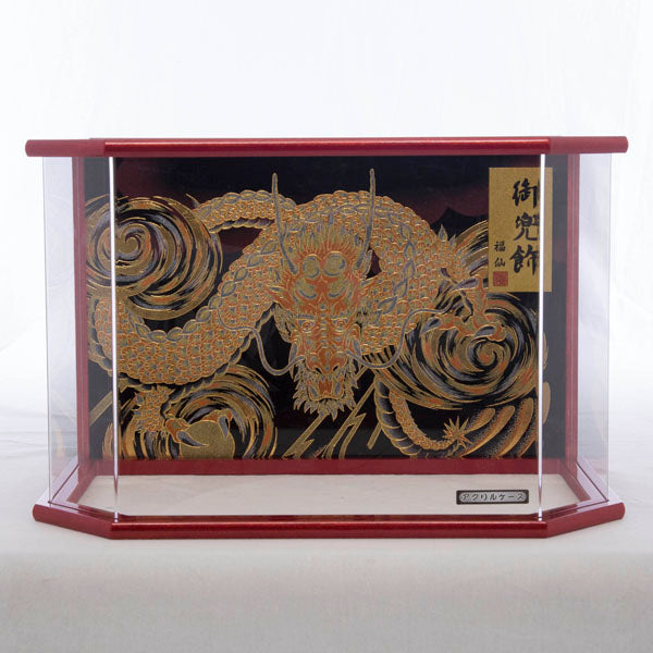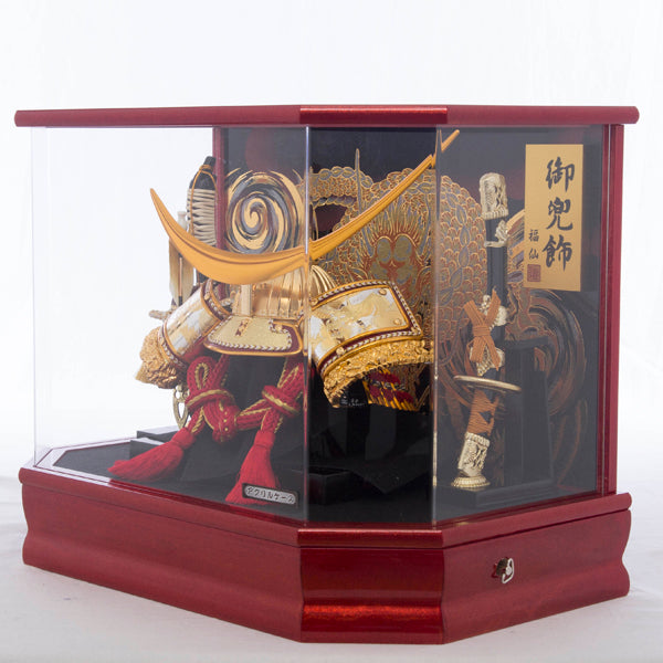 背景に配した正面を向く龍と、朱色を基調としたケースが、伊達の兜の勇ましさを演出する六角のケース飾りです。