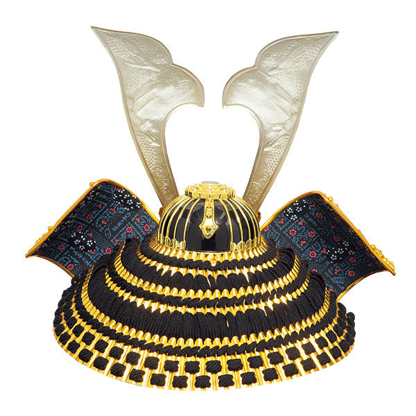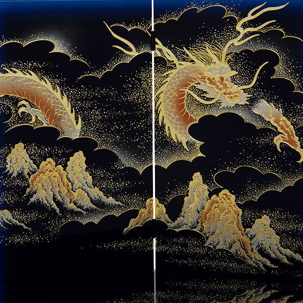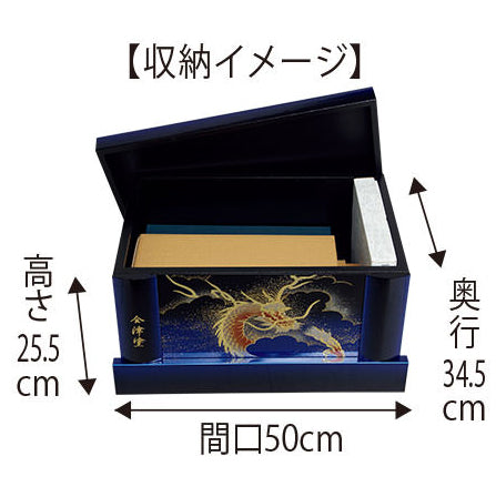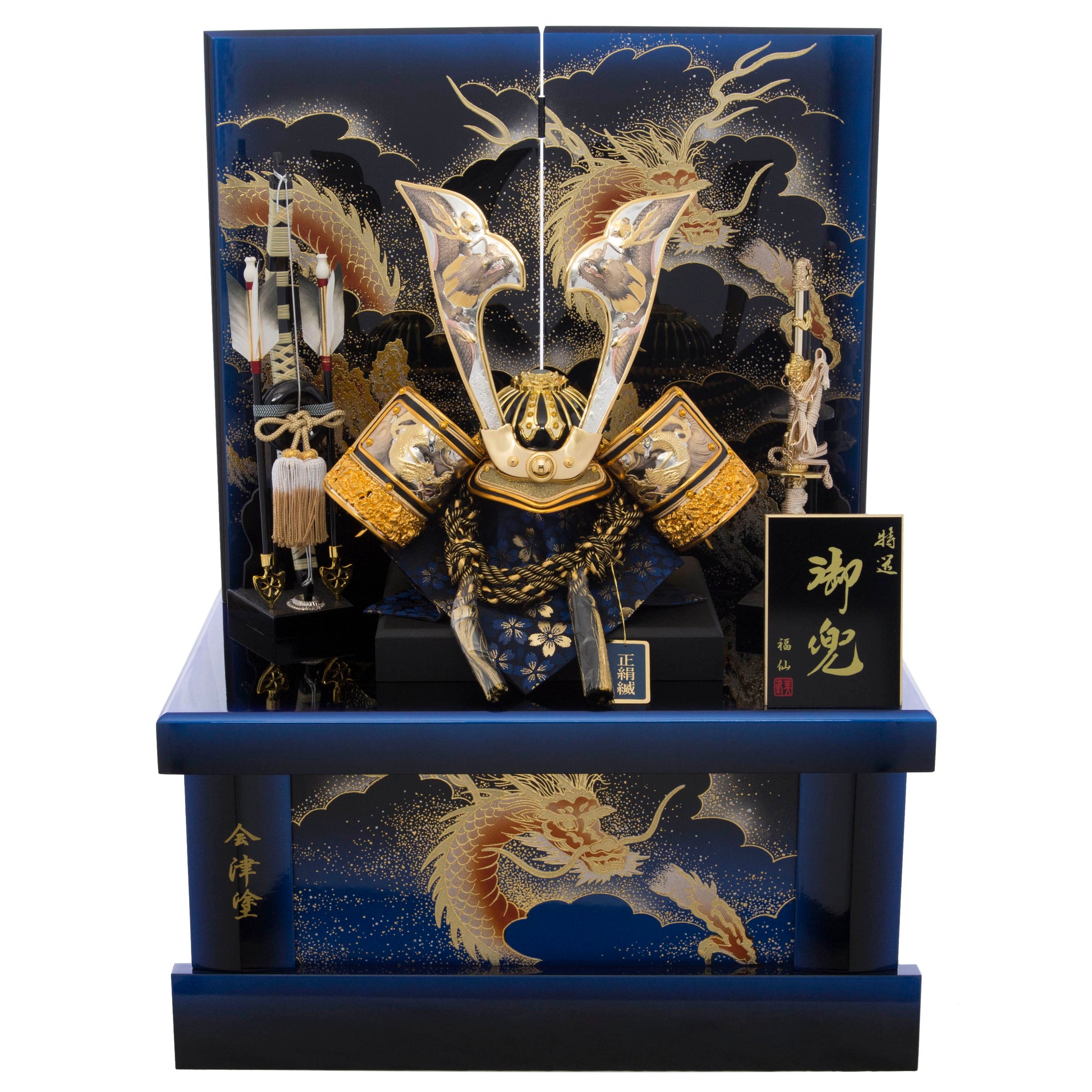 大きな鍬形に配した龍が勇ましさを表した兜に、青の光沢が美しい会津塗の台屏風を合わせた兜収納飾りです。