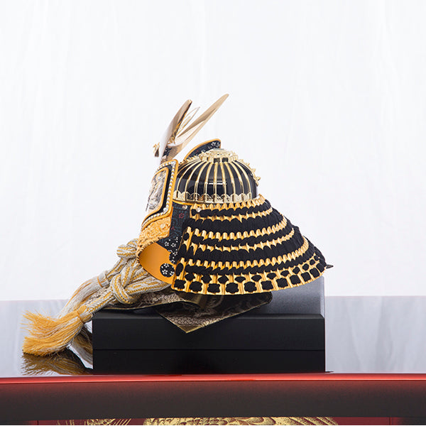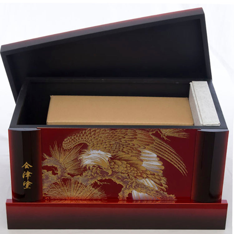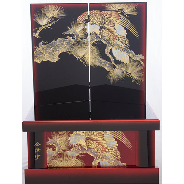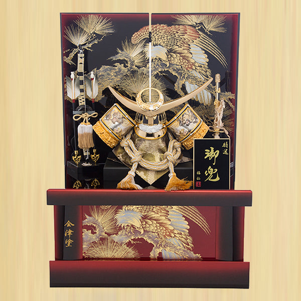 会津塗の台屏風に配した、松と鷹が特徴の兜収納飾りです。