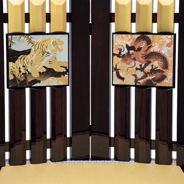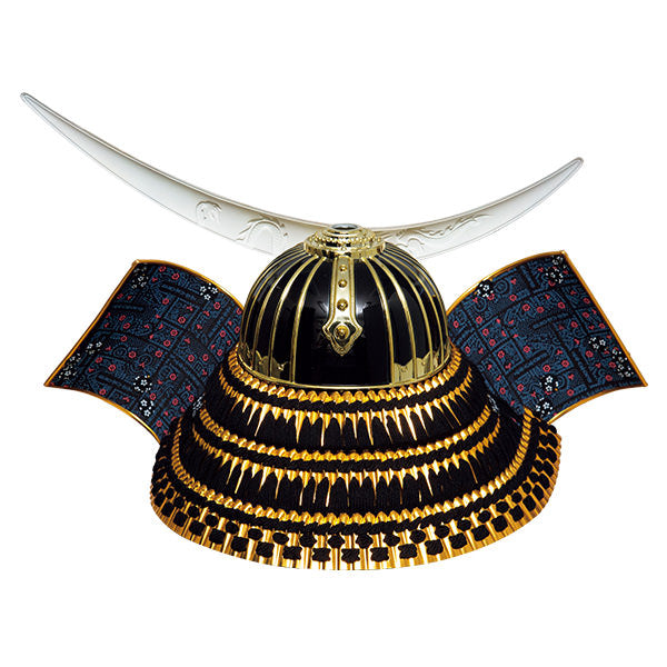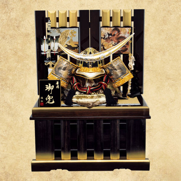 濃い茶色を金色でぼかした飾り台に、格子の二曲屏風が見事な兜飾りです。お子様が被って記念撮影できる着用タイプです。