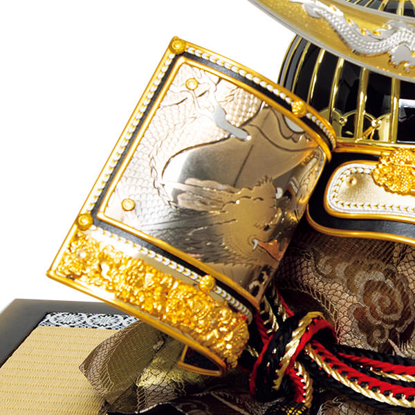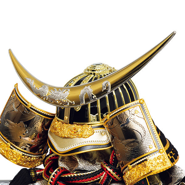 三日月の前立てと吹き返しに龍の絵柄を配しました。
