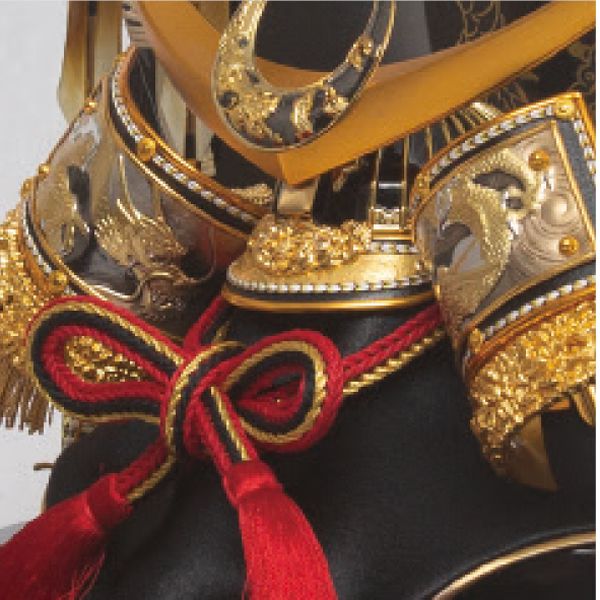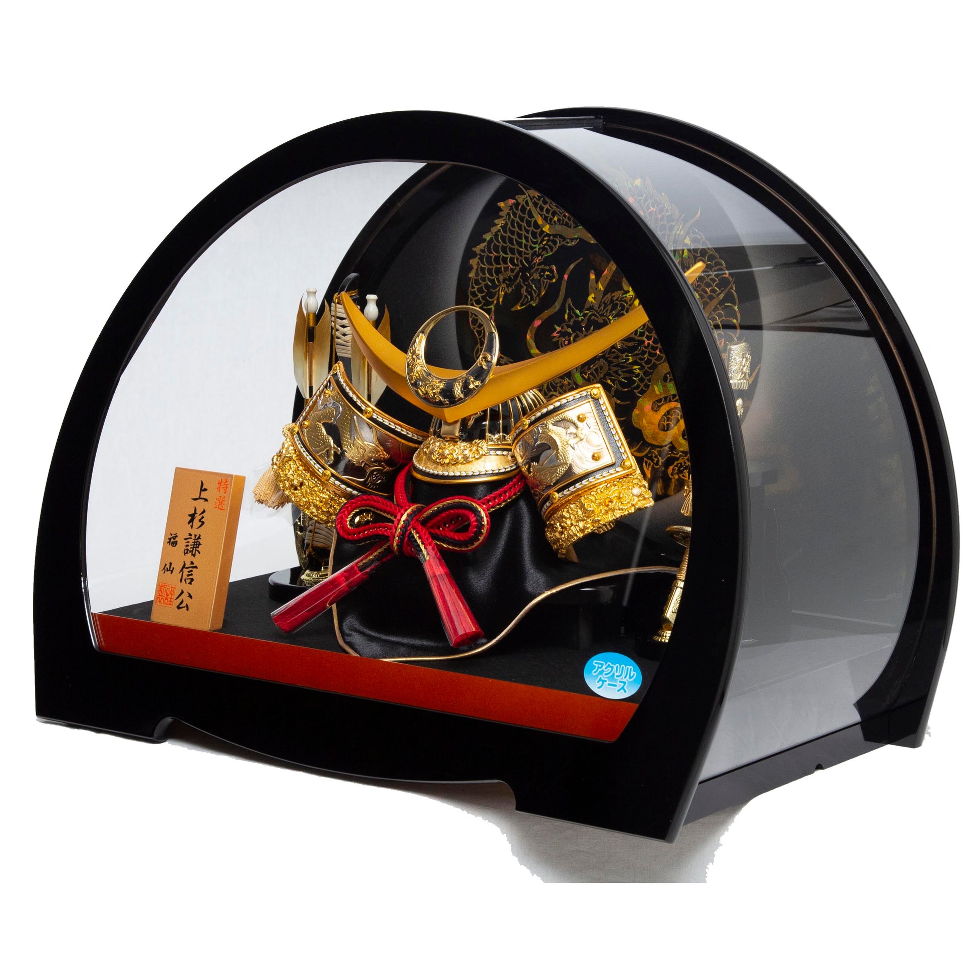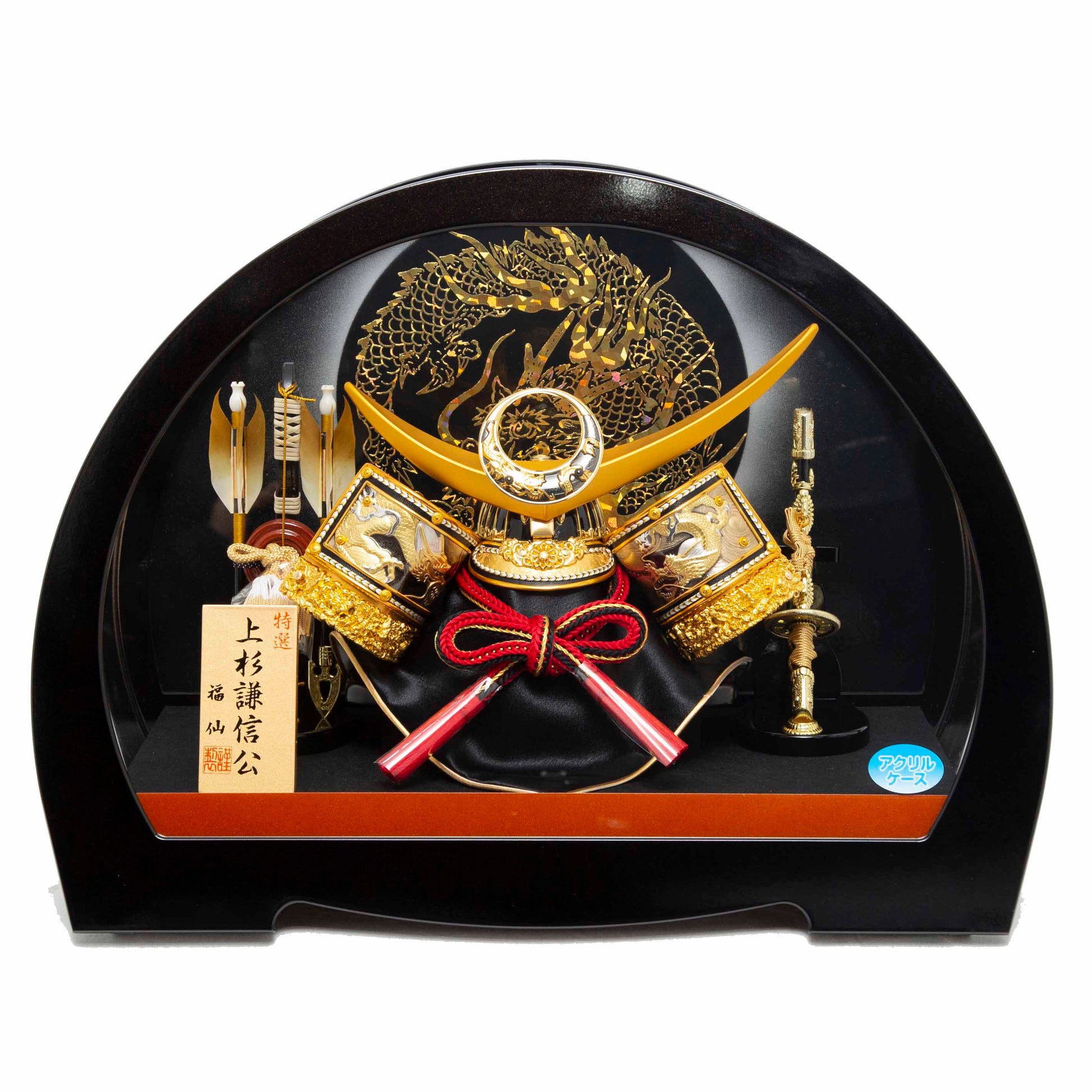 背景には円龍を配した上杉謙信公の兜飾りです、雄々しい龍を配した緋色の忍びの緒がアクセントです。