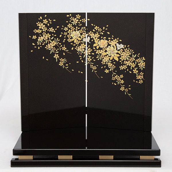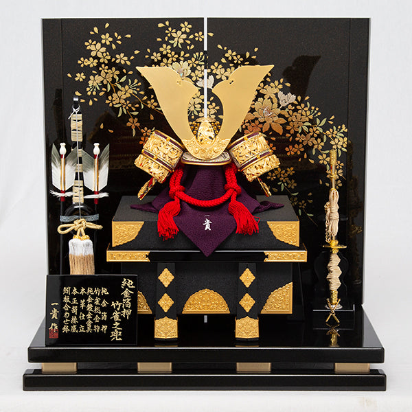 満開の桜と山水の京金彩蒔絵を施した台屏風が、金沢金箔押兜を豪華に彩ります。