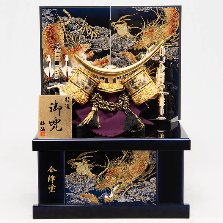 黒地に青をぼかし、金彩の龍虎を配した会津塗の台屏風に、伊達政宗公の兜を据えました。