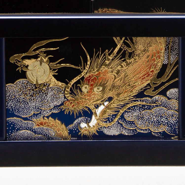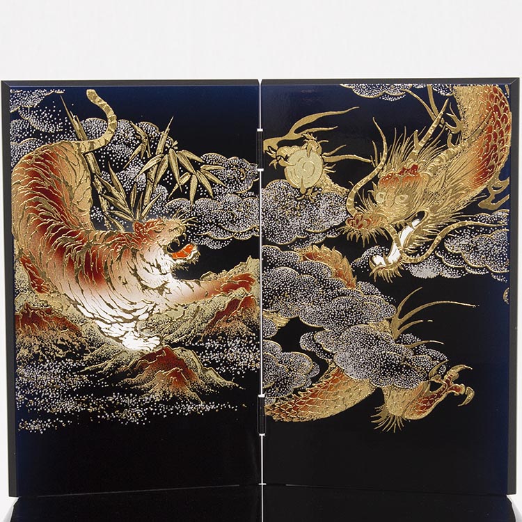 会津塗の台屏風に、金彩で勇猛な龍虎を描きました。