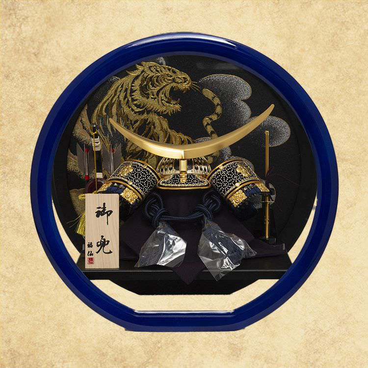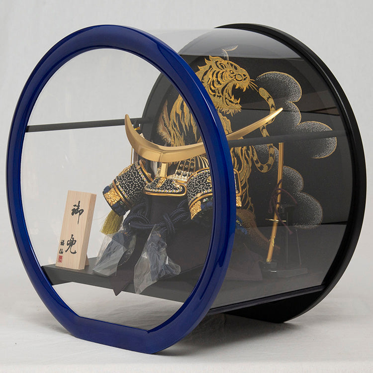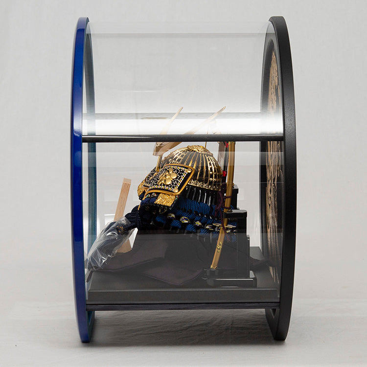 蒼色の個性的な円形のケースには三日月の前立ての伊達政宗公の兜を配しました。
