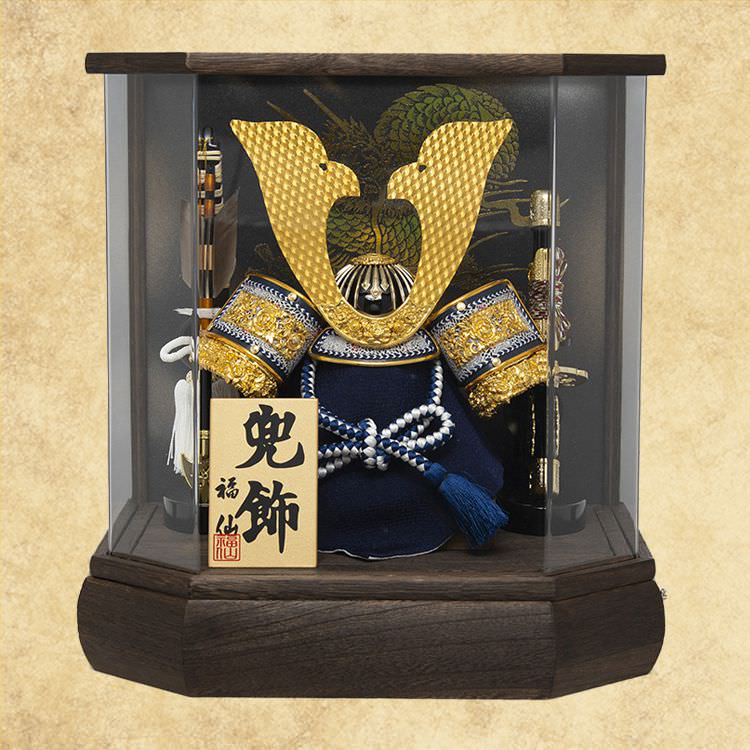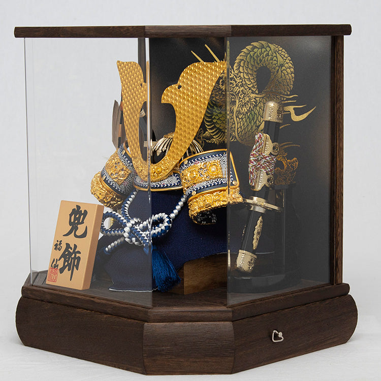 焼桐の六角アクリルと金色と青を基調にした兜が特徴の軽量アクリルケースです。