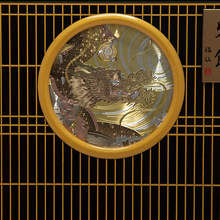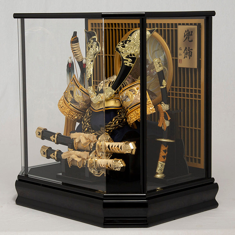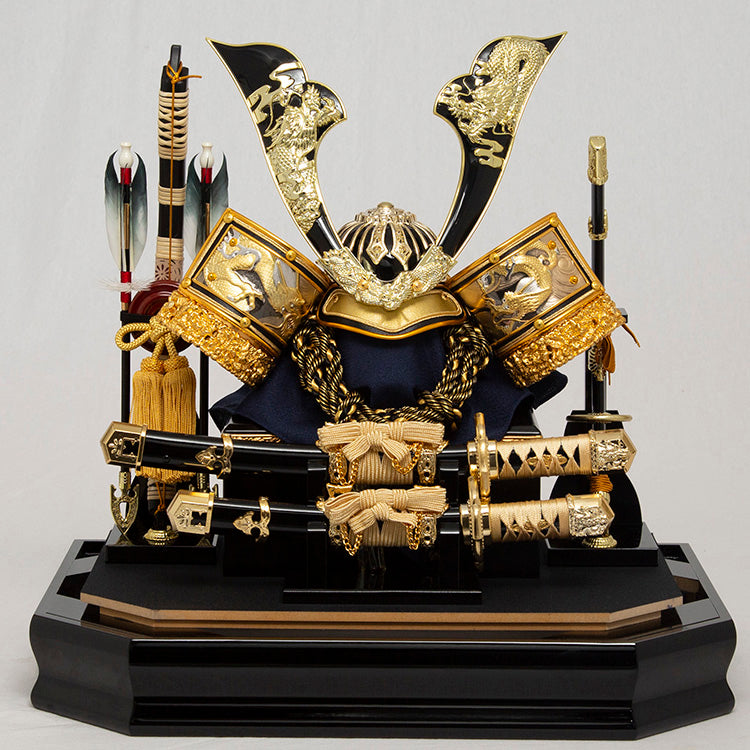 背景には高級感のある金の格子飾りに龍を配し、兜飾りを豪華に引き立てています。