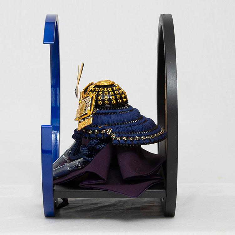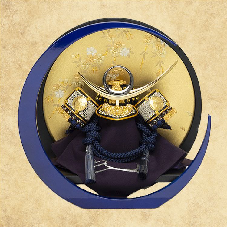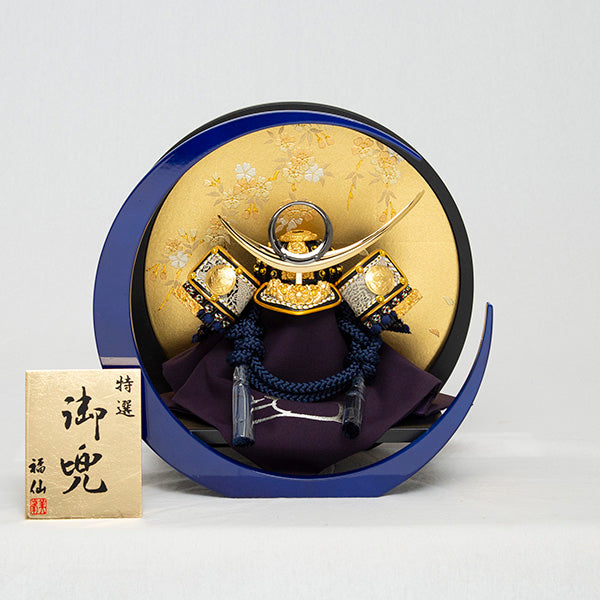 月を模した蒼色の飾り台が特徴の兜飾りです。