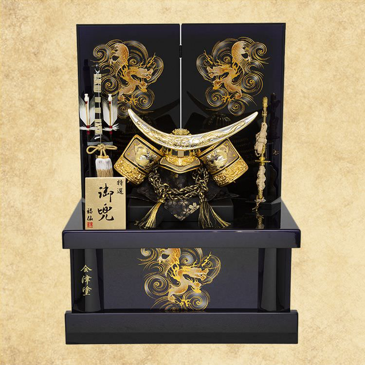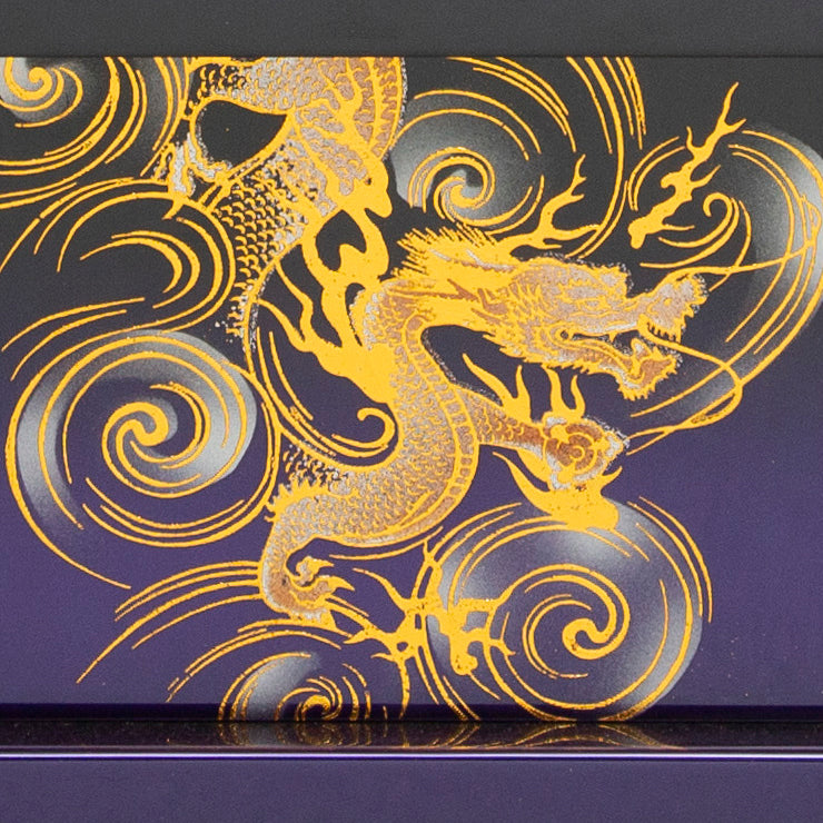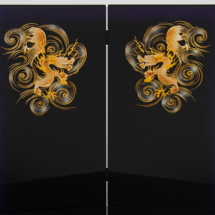 深い紫色が特徴の台屏風には金彩で勇猛な龍を描きました。