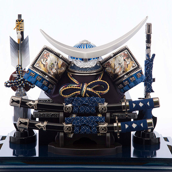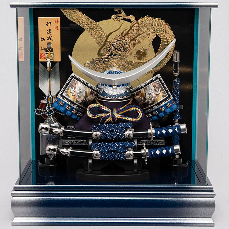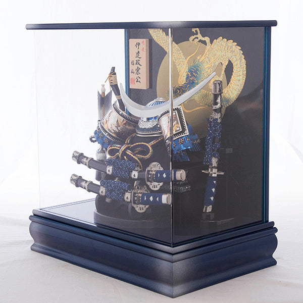 銀色でぼかした青いケースに三日月の前立ての伊達政宗公の兜を飾り付けました。