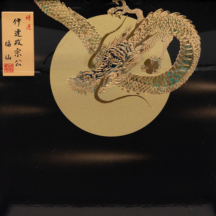 背景に黄金の龍を配した兜飾りです。