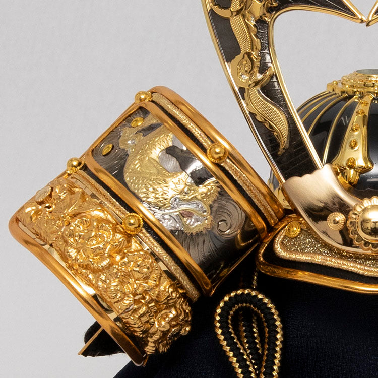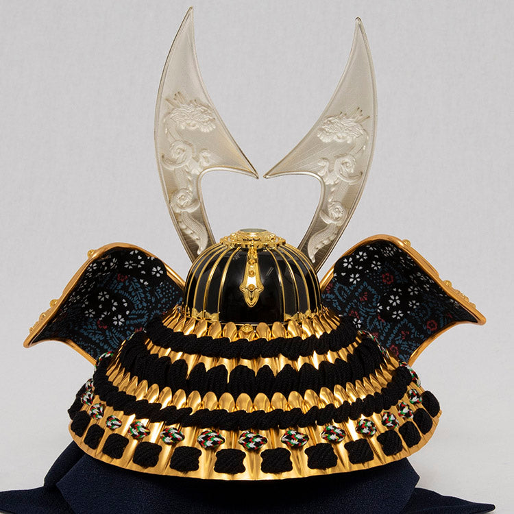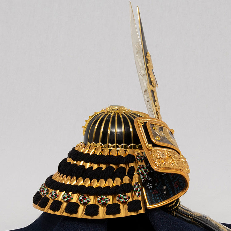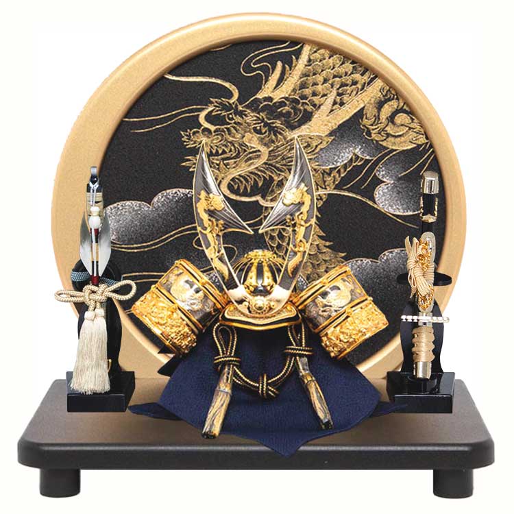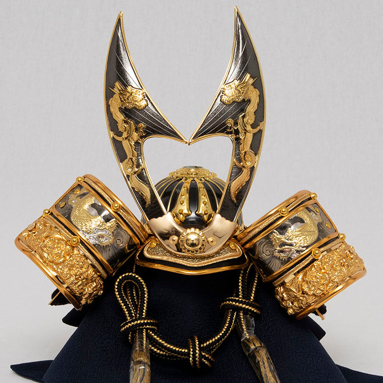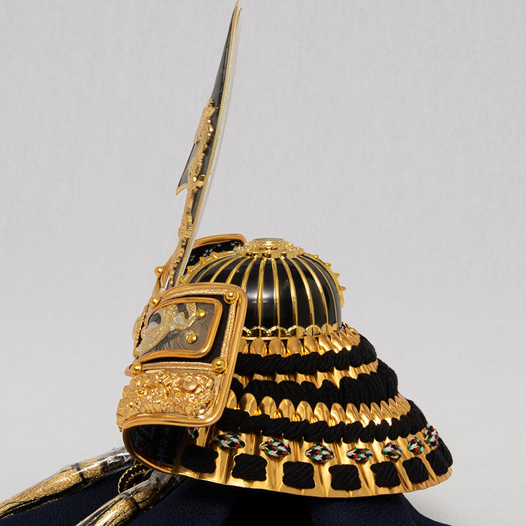 置き場所を選ばないコンパクトなサイズと、黒と金を基調にした飾り台に前立てに双龍を配した雄々しいはやぶさ兜が特徴的です。