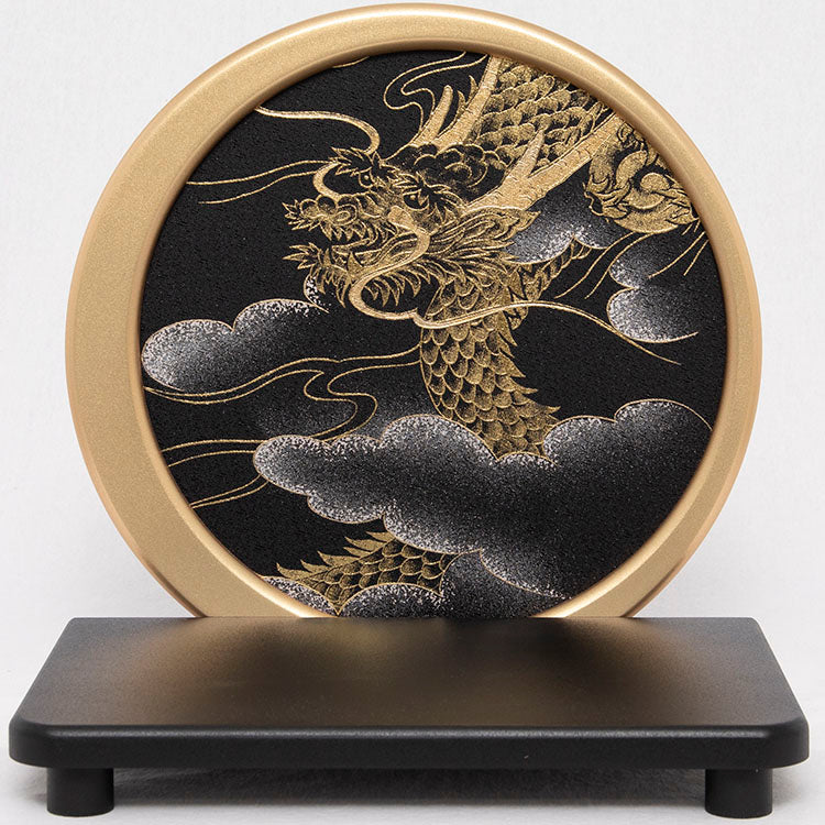 背景の月を模した屏風に龍が躍動する兜飾りです。