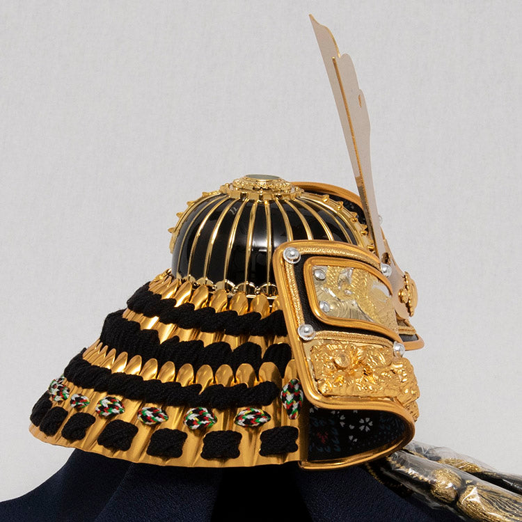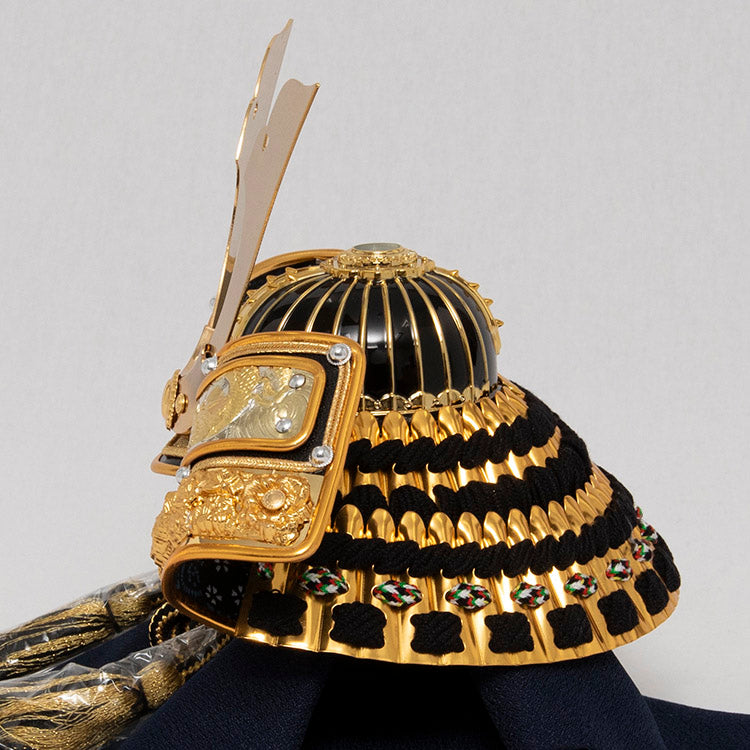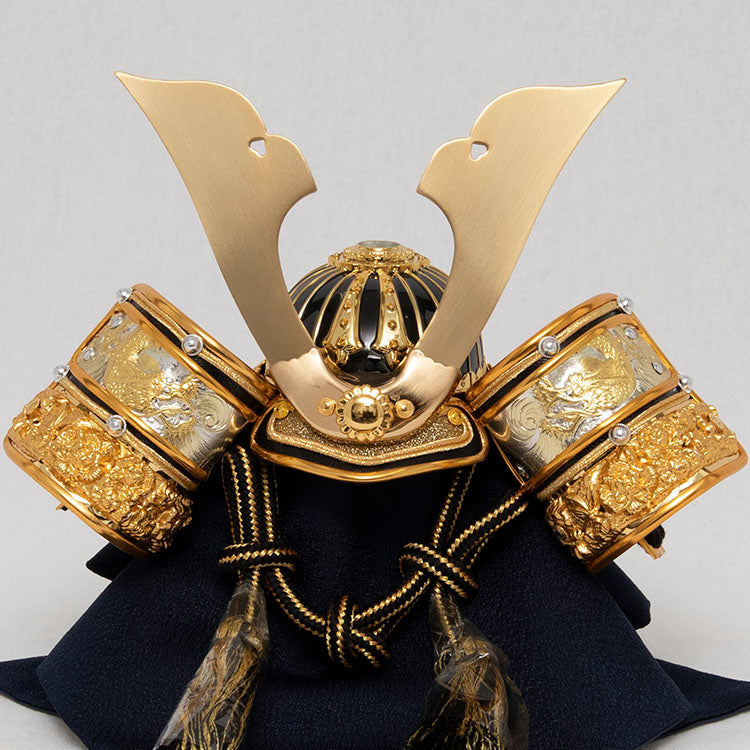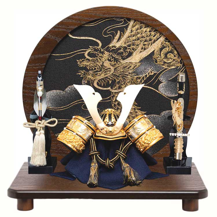 置き場所を選ばないコンパクトなサイズと、木目の美しい飾り台に大鍬形と吹き返しの龍が一際目を惹く、調和の取れた兜飾りです。