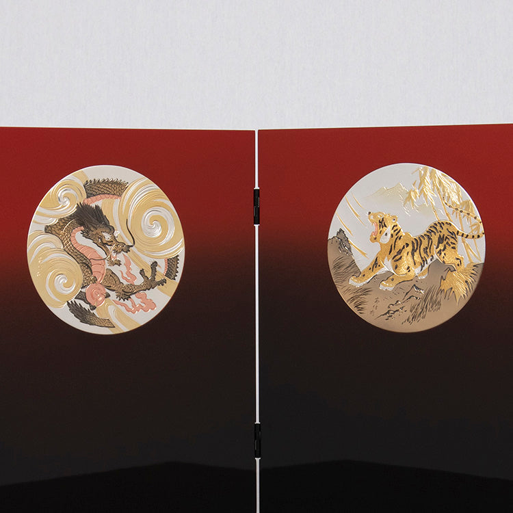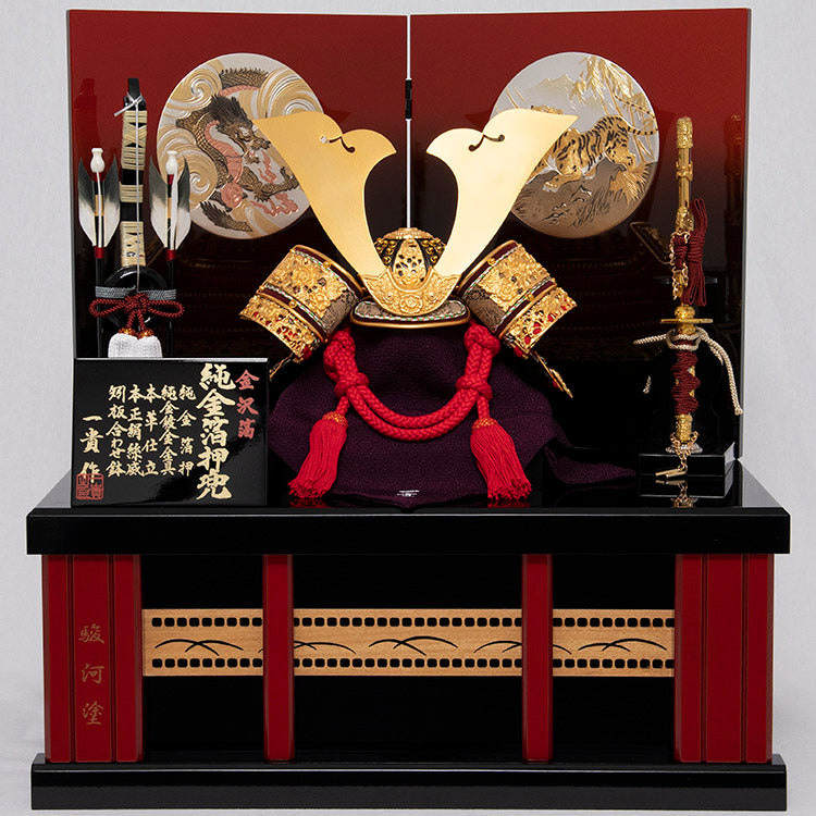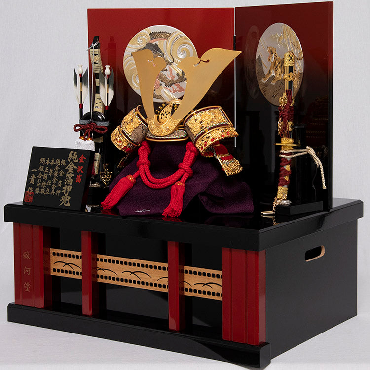 屏風に配した龍虎の彫金が特徴的な台屏風に、純金鍍金の大きな鍬形が見事な兜をあわせた逸品です。
