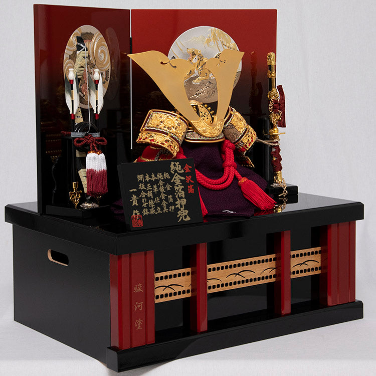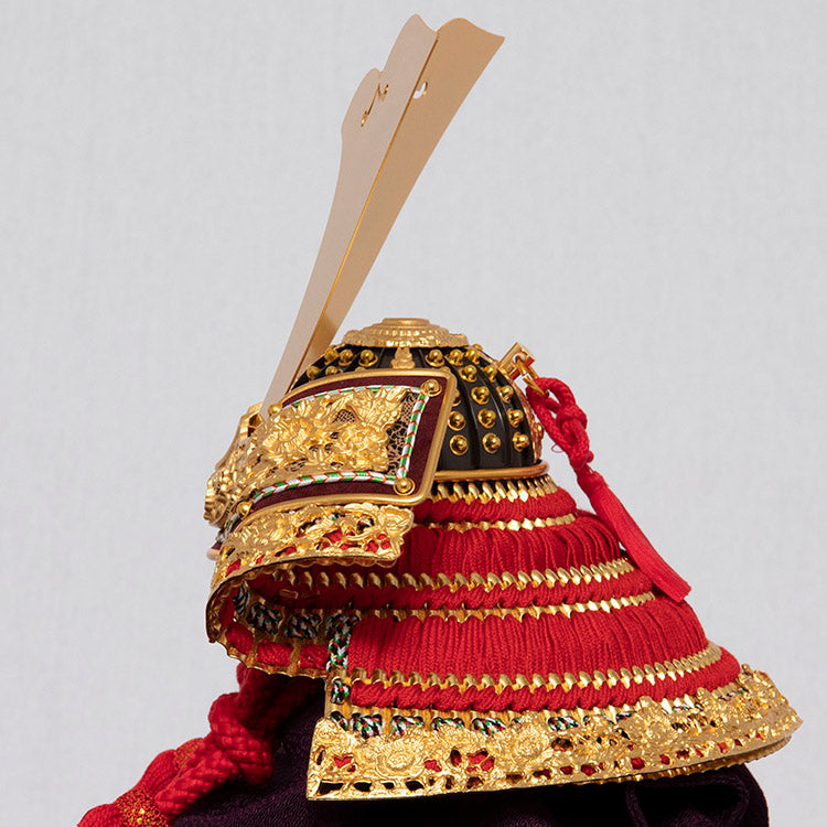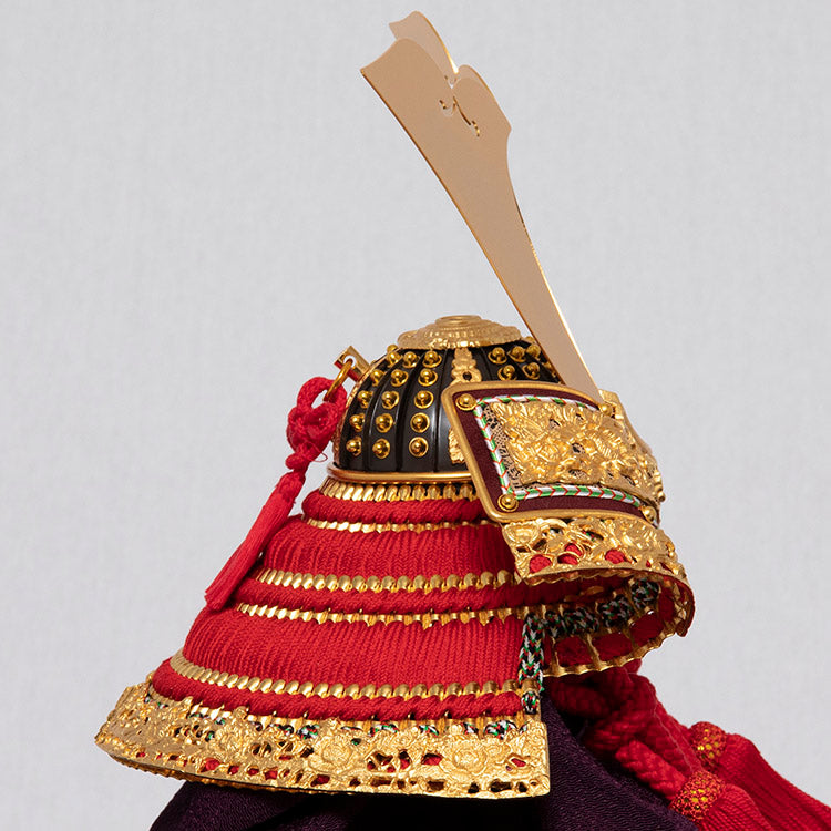 兜は金沢金箔を熟練の職人が丁寧に箔押した匠の技が光る逸品です。太陽の色、力強い赤色の正絹縅糸を使用し、純金鍍金の金具にて豪華に飾りつけました。