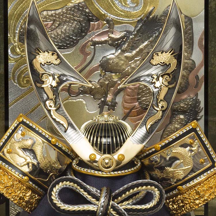 背景に飾り付けた龍の彫金飾りが兜を豪華に演出しています。