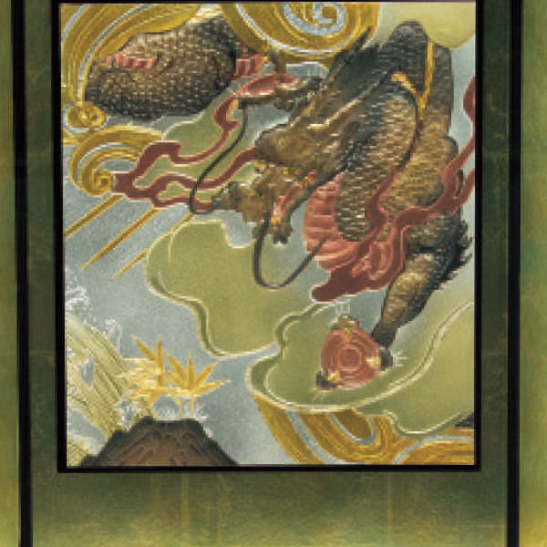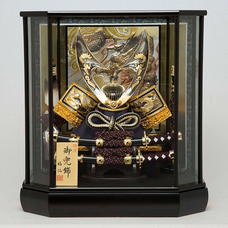 鍬形・吹返しにも龍を配し勇壮さを特徴に仕上げた六角形の特徴的な兜ケース飾りです。