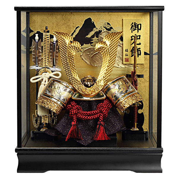 背景に連山を配したコンパクトな兜飾りです。吹返しの彫金飾りが兜飾りを豪華に演出しています。