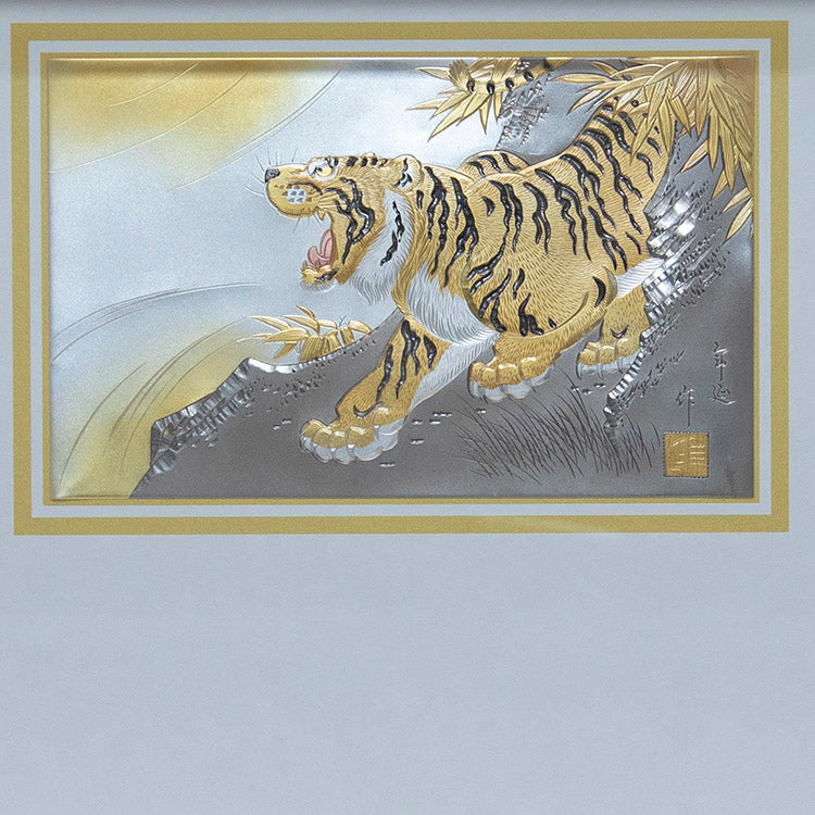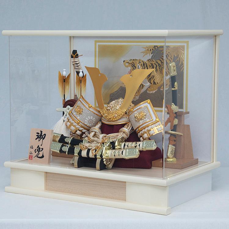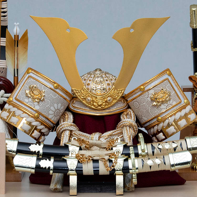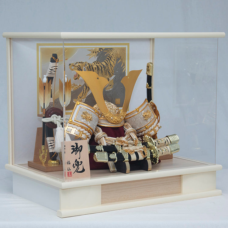 明るいアイボリー色のケースに金色と白を基調とした兜飾りを合わせました。