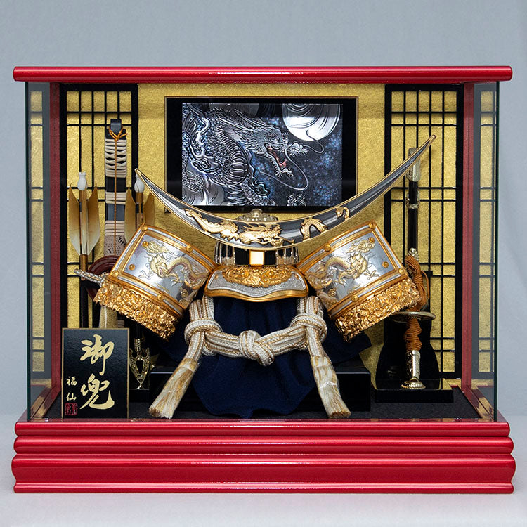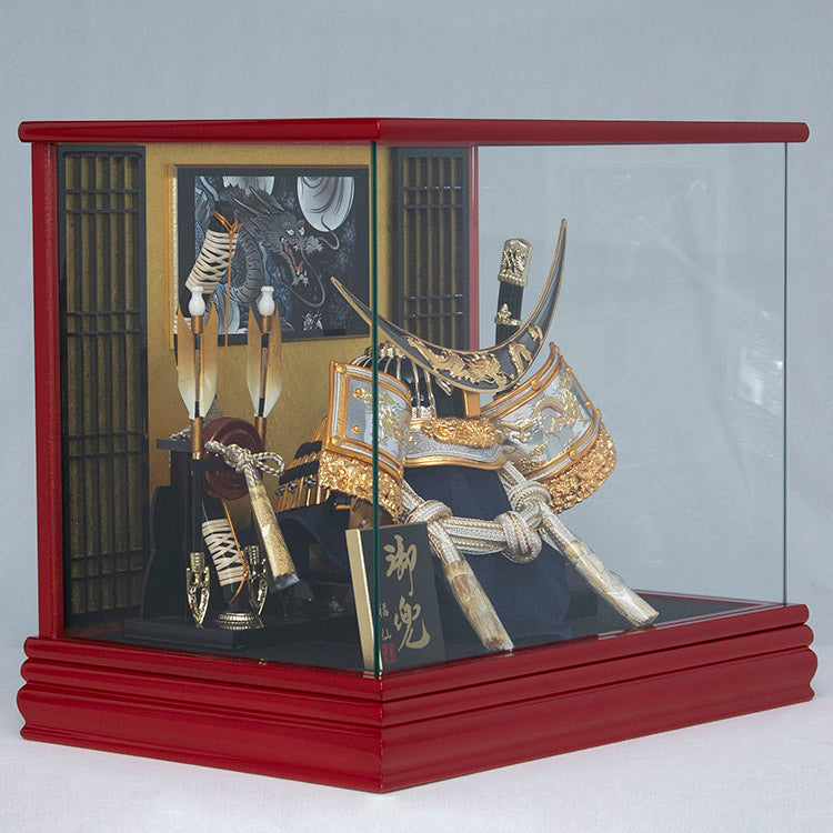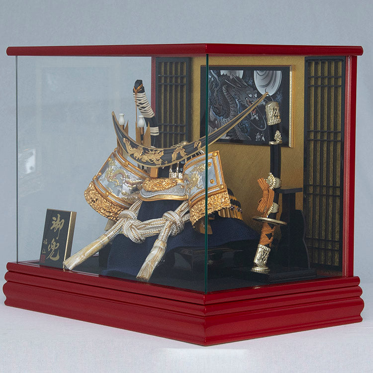 一際目をひく縁起の良い【朱色】のケースに、黄金に輝く兜を配しました。