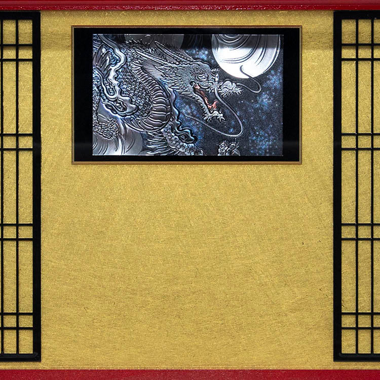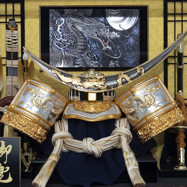 背景には勇壮な龍と、高級感の溢れる格子を配し、上杉謙信公の兜を際立たせます。